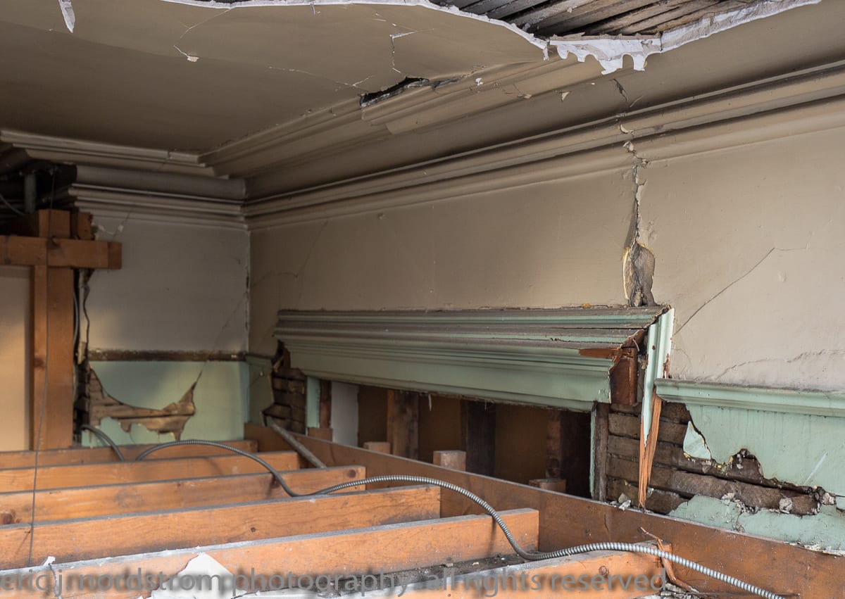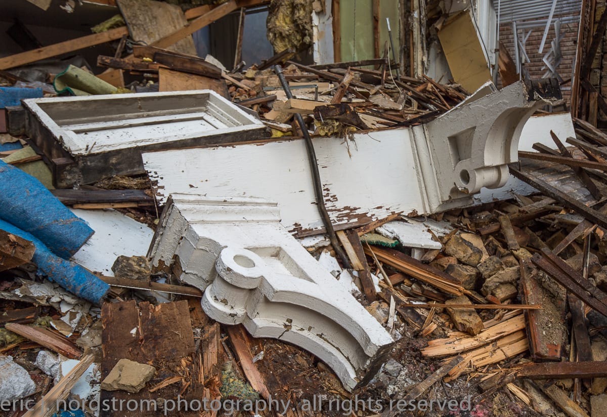 i have never worked with this wrecker so i’m on the sidelines documenting the carnage. based on the now-destroyed solid walnut staircase with multi-faceted newel post and corbels found in the rubble, it clear no one secured salvaged rights. shame.