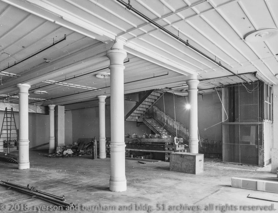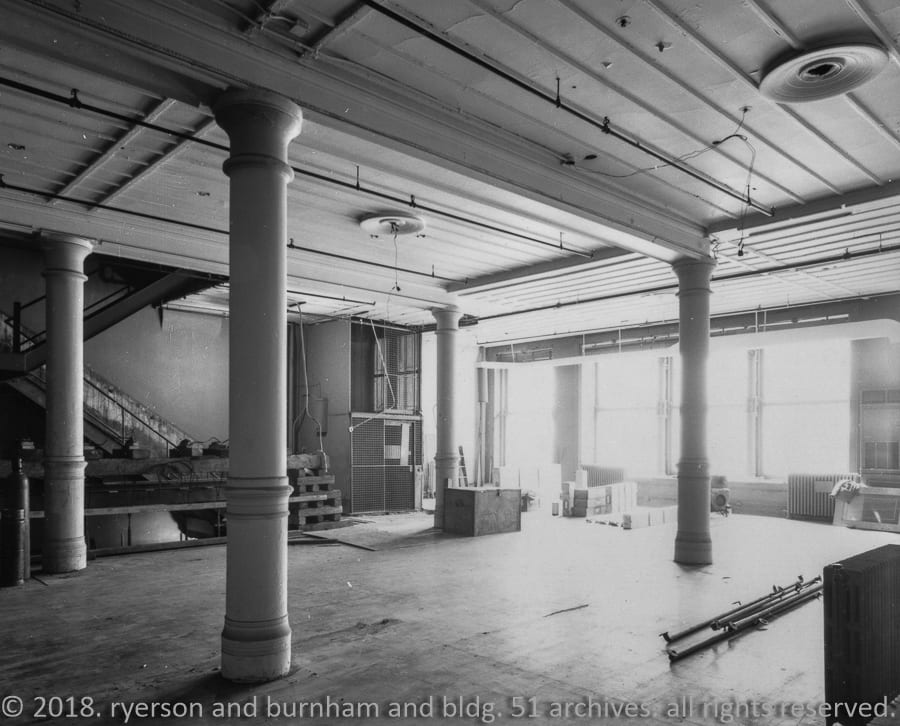 with the exception of a few oversized steel-cut plaster ceiling medallions and plaster-covered columns with incised rings and flared capitals, the interior spaces were mostly stripped down to brick walls.