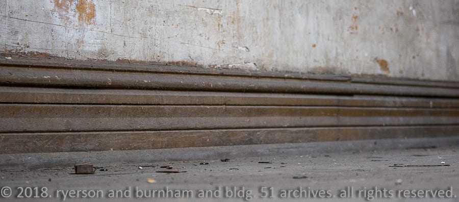 two oak wood paneled bathroom enclosures with bullseye blocks and scattered sections of original baseboard located at the back of the building near the walk-in vaults and freight elevators remain mostly intact, but i suspect it’s “stock” sourced from a chicago-based millwork company.