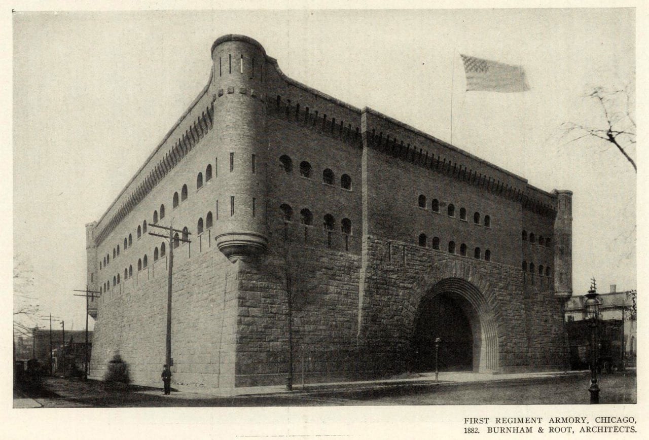 fearing the potentially violent protest of working class laborers, as well as in reaction to the haymarket affair, the residents of chicago’s prairie avenue “millionaire’s row” (prominent figures such as marshall field, george pullman, phillip armour, potter palmer and others) placed pressure on politicians to construct an armory to protect the city’s most prominent businessmen. daniel burnham and john root were commissioned to design the first regiment armory at 1552 s. michigan avenue, just three blocks from this high-end neighborhood.