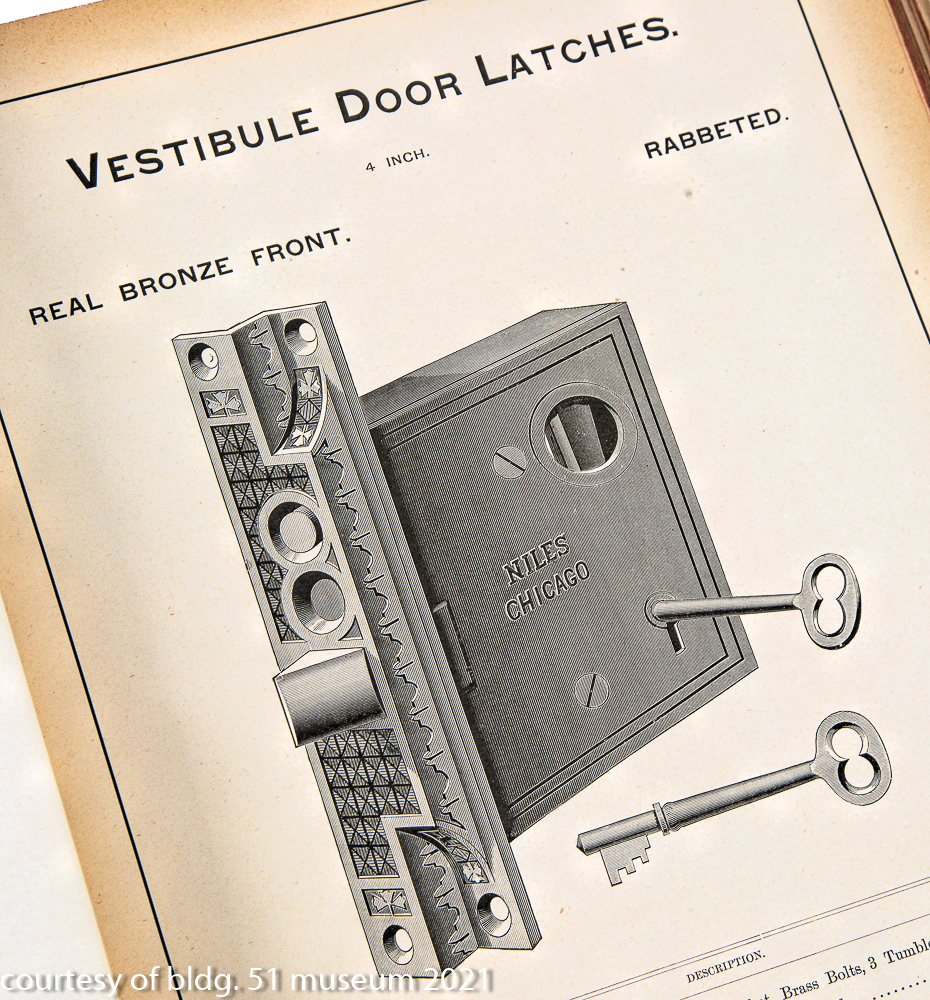 in 1878, a new means of opening doors was patented by milton and sidney niles and manufactured by the chicago hardware company. when installed on a door, the “niles patent” locks and doorknobs appear no different than hardware fabricated by other manufacturers of the period. the innovation of the niles system is in the installation: the doorknobs were designed with extra-long shanks that fit directly and securely into mortise locks, with each knob activating the latch independently of the other. as advertisements of the era for chicago hardware exclaimed, the niles knobs and locks were “always perfectly adjusted.” they effectively eliminated set screws and the washers required to adjust the fit of the doorknobs in the escutcheon plate. with the advent of the niles patent, it was said, “one need never have to worry about jiggling handles, door thicknesses and stripped screws ever again.”