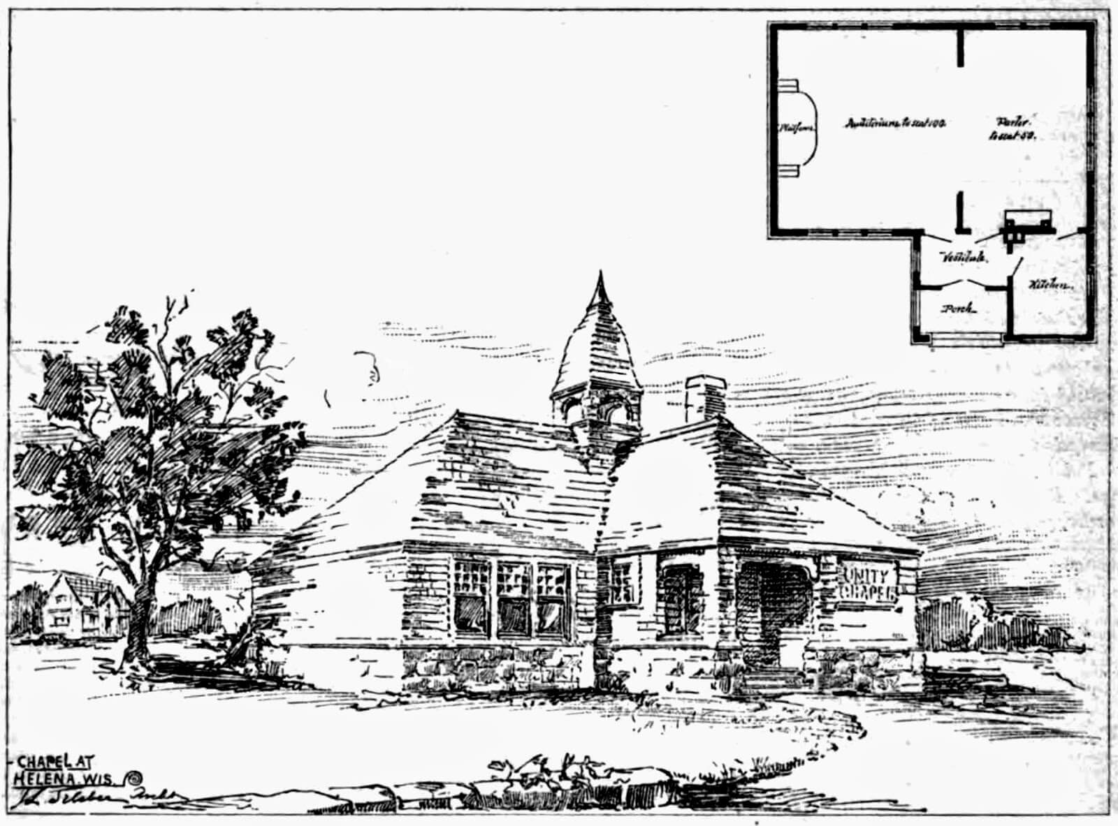 images of the wood-framed shingle style chapel, incised stone gate posts and surrounding graveyard are posted below.