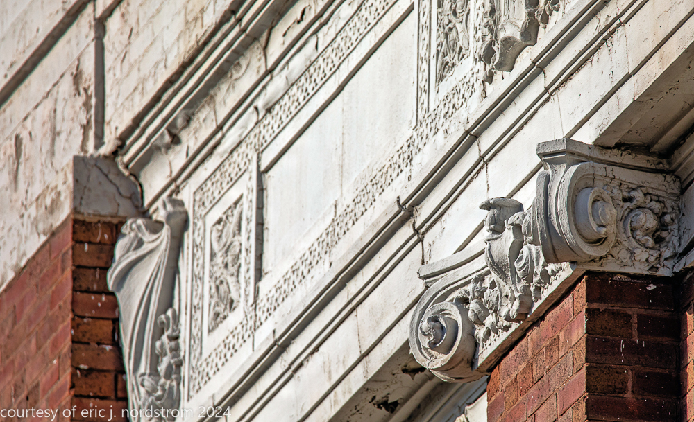 nimmons and fellows’s prairie style sears administration building (1905, 1914) remains mostly empty and somewhat neglected, as more and more boards are replacing windows. the building is currently for sale, but hasn’t found a buyer – yet. the exterior cream-colored sullivanesque style terra cotta ornament was designed by george c. nimmons and remains mostly intact despite being painted over. another building to keep a close eye on.